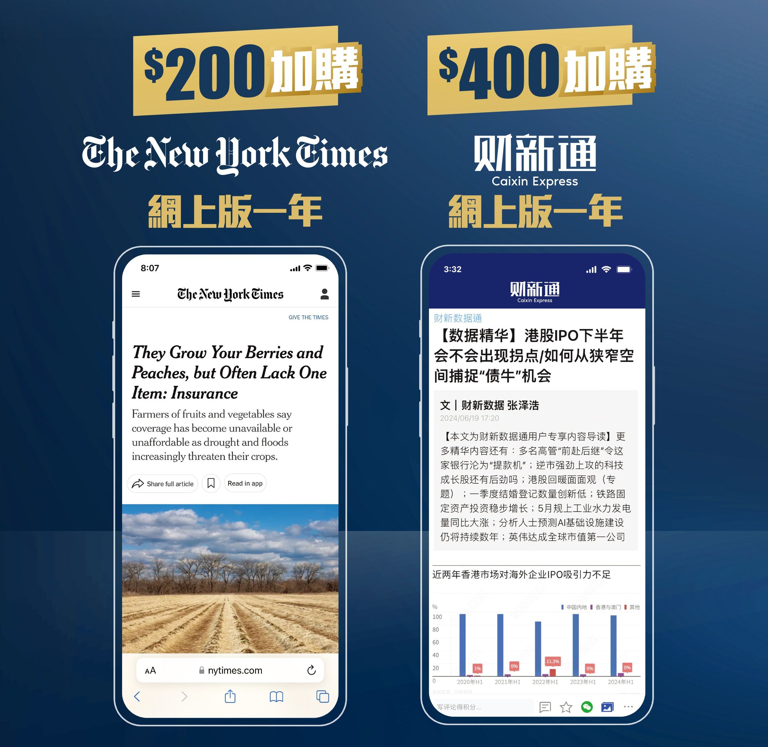 除以往傳統嘅訂閱計劃外,今年更加入《紐約時報》及《財新通》合併訂閱計劃,