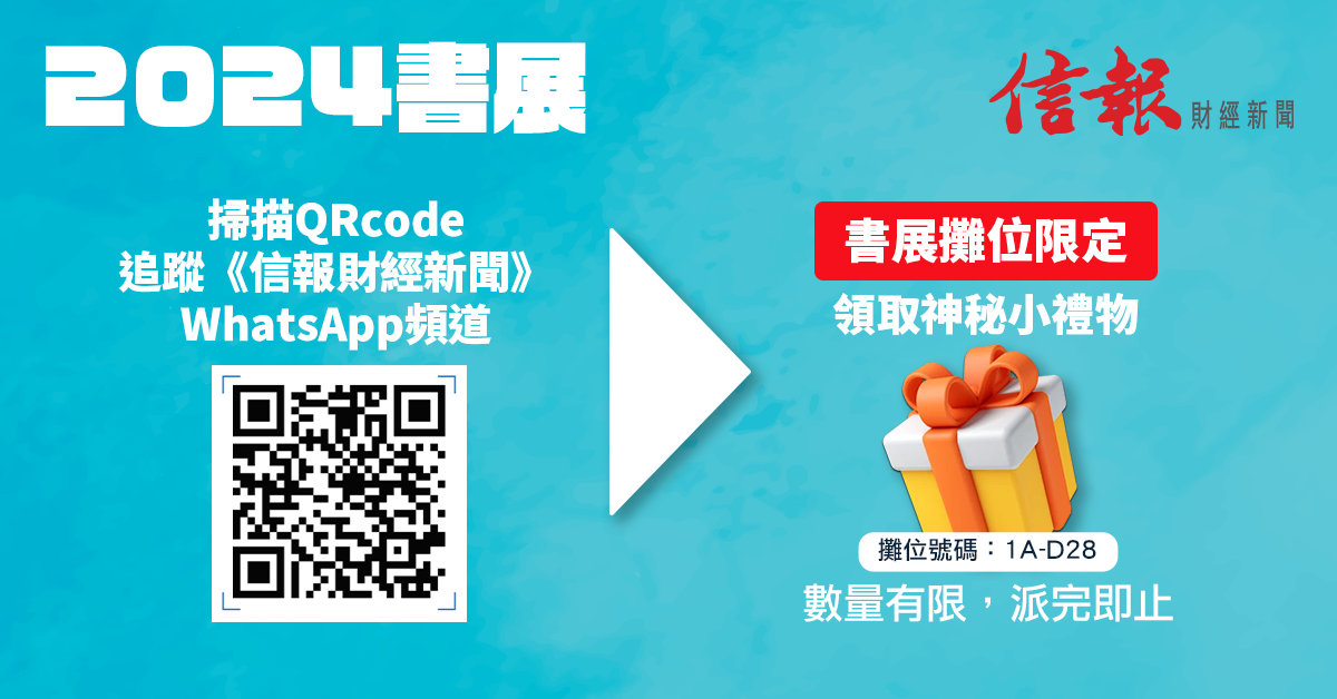追蹤《信報財經新聞》WhatsApp頻道,前往書展攤位1A-D28出示「已追蹤」頁面,即可獲得神秘小禮物乙份(數量有限,派完即止)